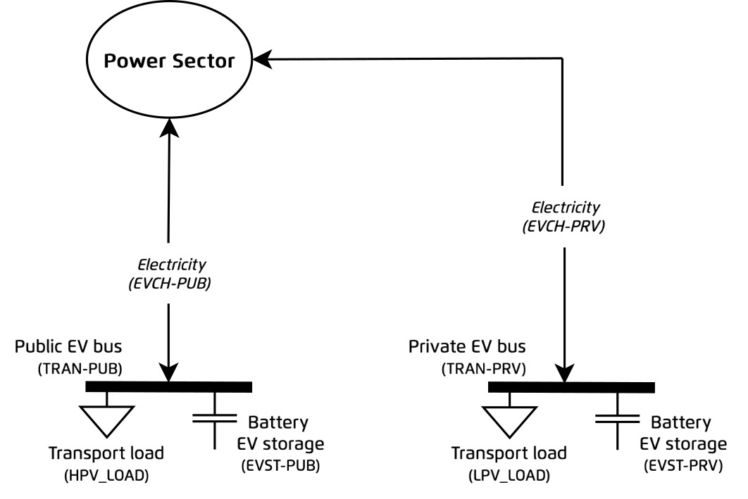 In the transport sector, PyPSA-SPICE separated the demand and energy flow into two categories: private and public sector. The public sector (PUB) encompasses public transportation services, while the private sector (PRV) refers to personally owned vehicles.